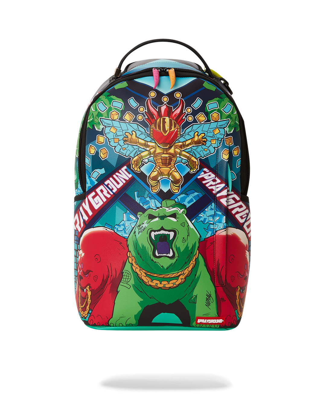 Dimensions: 18" x 6" x 11.5" • Front zipper pocket • Side pockets • Zippered Stash pocket • Separate velour sunglass compartment • Ergonomic mesh back padding • Adjustable Straps for custom sizing • Gold zippers with metal hardware • Metal "Sprayground Authentic" badge • Slide through back sleeve connects to carry-on luggage to free your hands