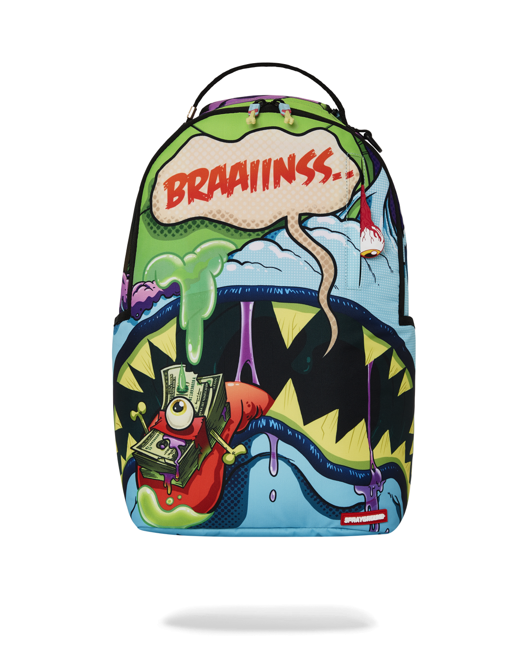 Dimensions: 18" x 6" x 11.5" • Front zipper pocket • Side pockets • Zippered Stash pocket • Separate velour sunglass compartment • Ergonomic mesh back padding • Adjustable Straps for custom sizing • Gold zippers with metal hardware • Metal "Sprayground Authentic" badge • Slide through back sleeve connects to carry-on luggage to free your hands