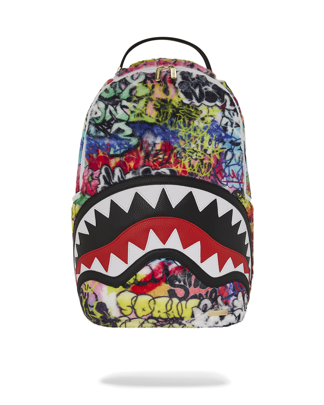 Dimensions: 18" x 6" x 11.5" • Front zipper pocket • Side pockets • Zippered Stash pocket • Separate velour sunglass compartment • Ergonomic mesh back padding • Adjustable Straps for custom sizing • Gold zippers with metal hardware • Metal "Sprayground Authentic" badge • Slide through back sleeve connects to carry-on luggage to free your hands