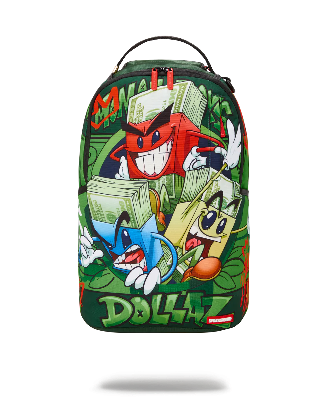 Dimensions: 18" x 6" x 11.5" • Front zipper pocket • Side pockets • Zippered Stash pocket • Separate velour sunglass compartment • Ergonomic mesh back padding • Adjustable Straps for custom sizing • Green zippers with metal hardware • Metal "Sprayground Authentic" badge • Slide through back sleeve connects to carry on luggage to free your hands