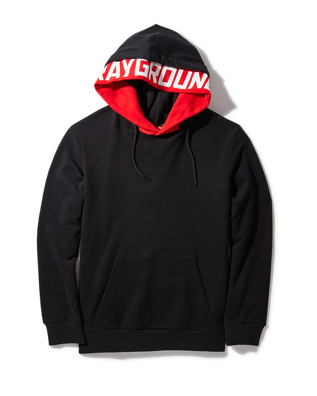Oversized SPRAYGROUND logo print detail at hood opening in contrast material